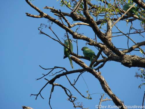 "Plum Headed Parakeet" (Psittacula cyanocephala/ Tuiya tota) - I have yet to see. But the guava-eating "Rose Ringed Parakeet" (Pisttacula krameri/ Tota, Lyber tota, Popat, Keera) - is fairly common. [Bangla = Tia or Tiye pakhi.] Pic: A pair of Rose Ringed Parakeet. Clicked at Sirpur Lake.
